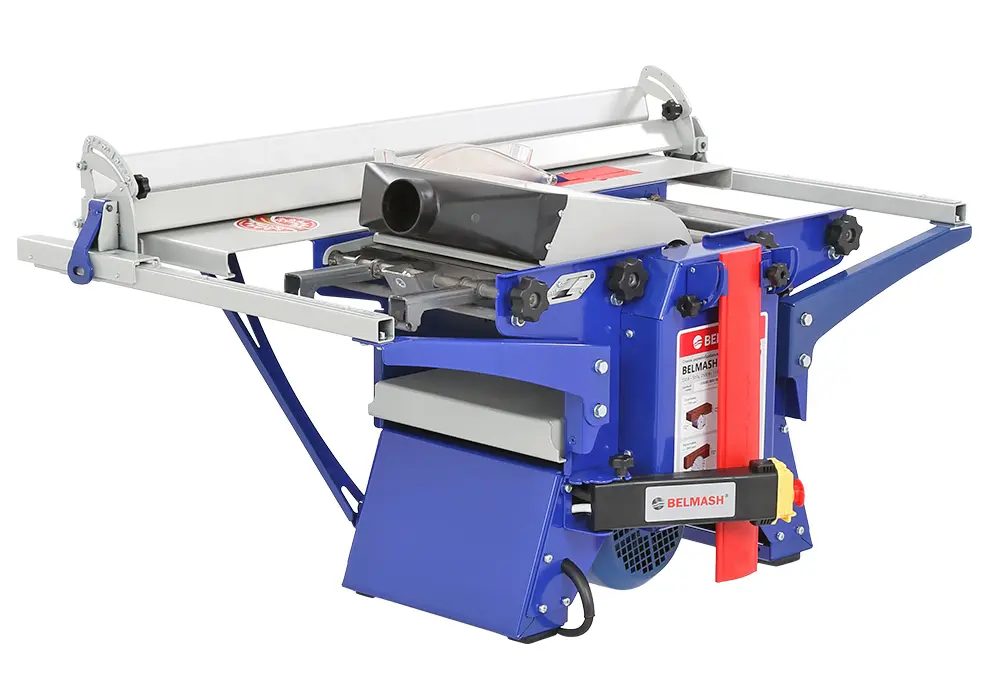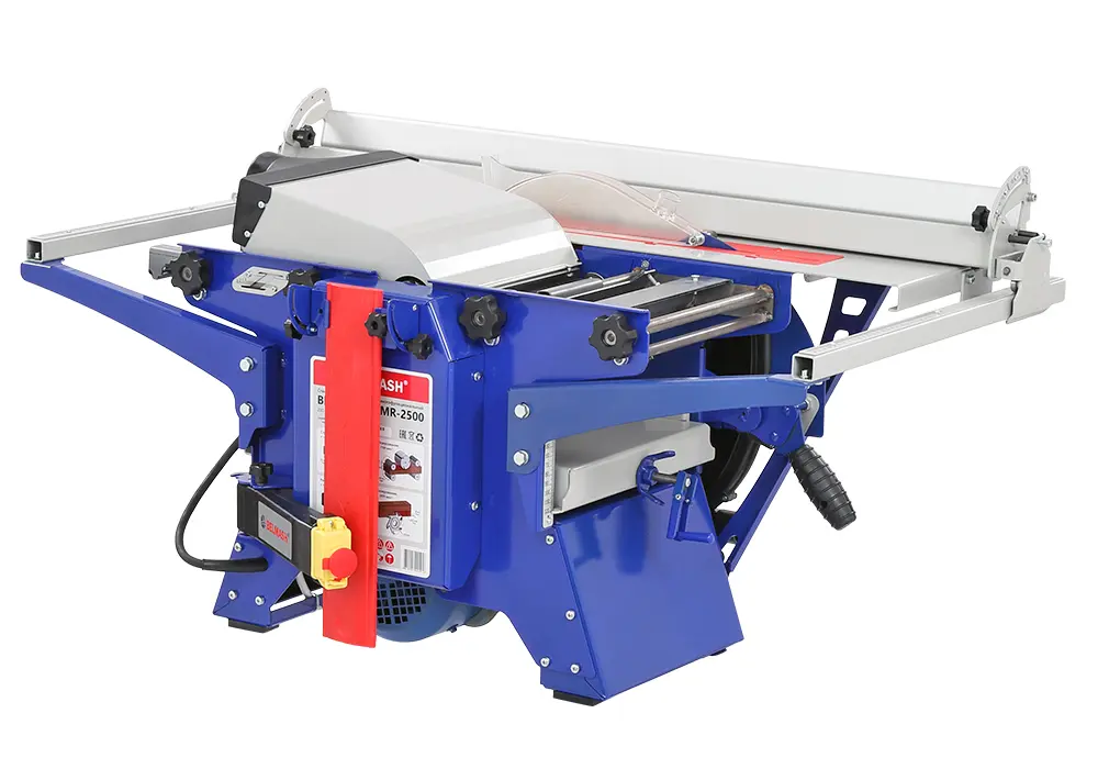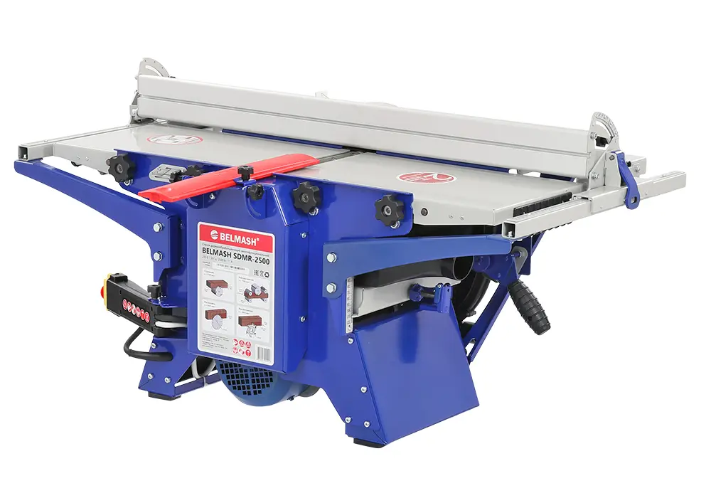 BELMASH SDMR-2500 – один из самых функциональных комбинированных станков «Завода Белмаш». В нем реализованы четыре ключевые функции, которые позволят выполнить базовые операции: распиловку, строгание/фугование, рейсмусование и фрезерование дисковыми фрезами.
