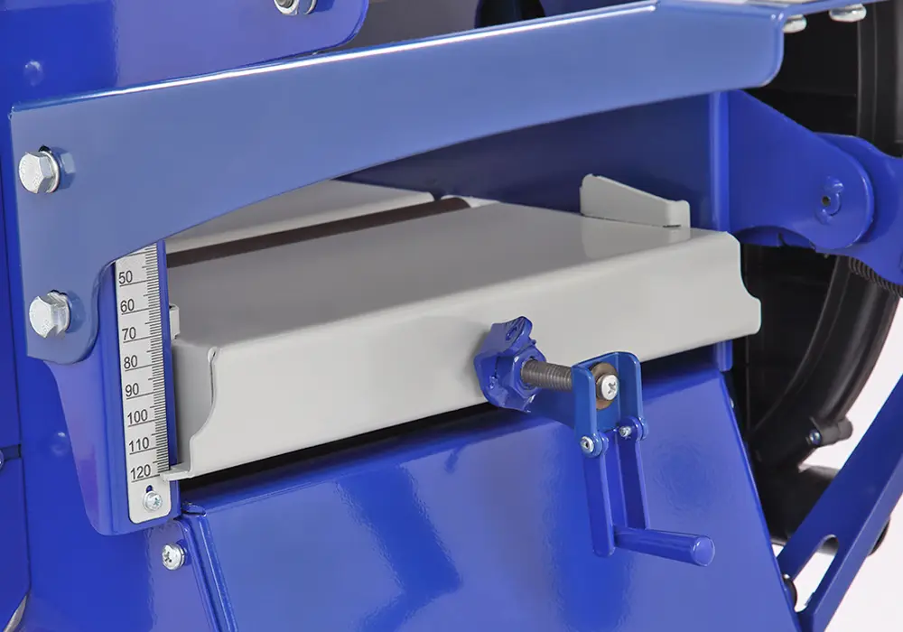 Рейсмусовый блок расположен в нижней части станка. С его помощью можно обрабатывать заготовки до 260 мм по ширине и до 120 мм по высоте. Подъем и опускание стола легко настраивается с помощью рукоятки. Движение осуществляется протяжными валами. Подача заготовки автоматическая, скорость – 6 м/мин. Максимальная глубина рейсмусования 3 мм. Размер рейсмусового стола (Ш×Д) 279×425 мм.