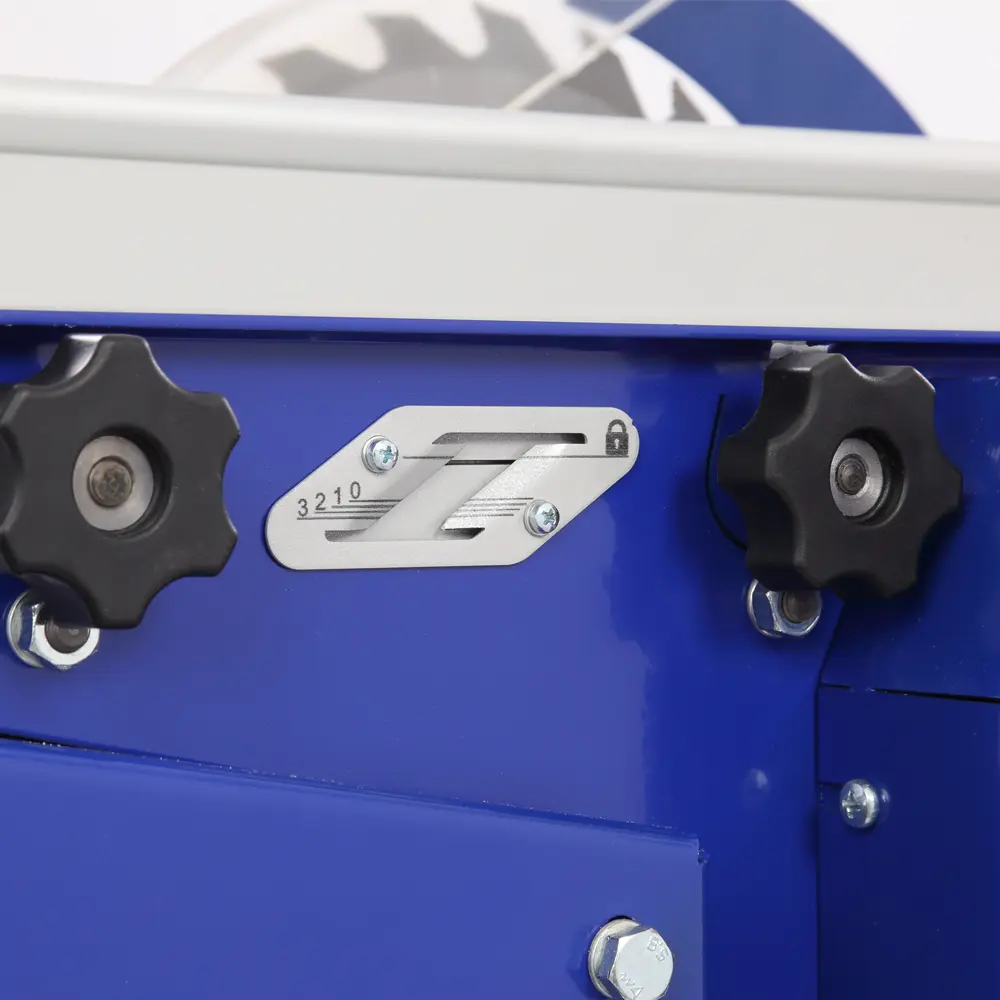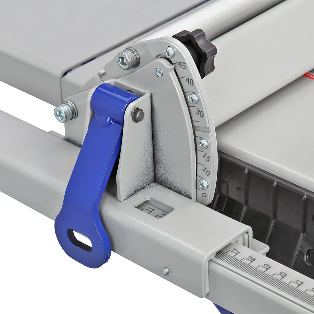 Станок оснащен параллельным упором, который устанавливается на направляющие со шкалами. Используется он как при пилении (с обоих сторон режущего инструмента), так и при строгании. Установка проста: на одной стороне упора находится зацеп, на второй – фиксатор. Направляющая упора выполнена из алюминиевого профиля. Ее можно установить под углом от 0 до 45°. Для точного позиционирования заготовки при распиловке станок имеет угловой упор. Он устанавливается в специальный паз на пильном столе. Заготовку можно ориентировать в диапазоне от -45 до +45 градусов.